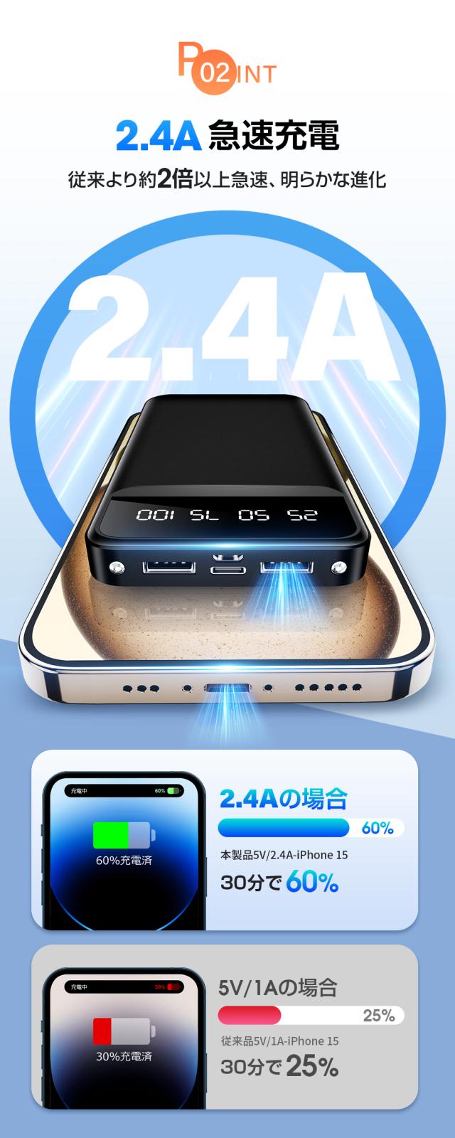 この40000mAh大容量モバイルバッテリーには、Smart ICという技術が搭載されています。デバイスに過度な電流が流れることを防ぎ、効率的な充電が可能になります。スマートウォッチやワイヤレスイヤホンなど、低電流で充電する必要がある小型デバイスにも対応できます。出力過圧保護/出力過電流保護/出力短絡保護/入力過圧保護/入力過電流保護/電池過充電保護/電池過圧保護/電池過放電保護など多重の安全保護措置を備え、安全と性能を一体化したモバイルバッテリーです。