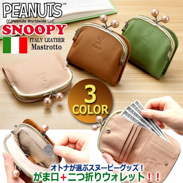 スヌーピーイタリアンレザー二つ折りがま口財布 (コンパクト シボ革 上質レザー キュート PEANUTS ユニーク)