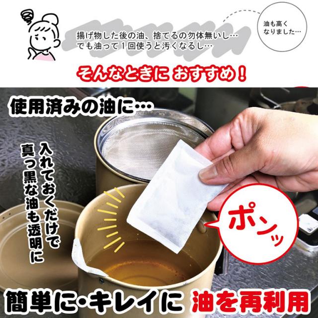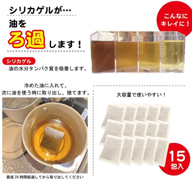| 備考 | ◆シリカゲルが油の水分タンパク質を吸着します。 ◆入れておくだけで簡単に油が綺麗になります。 ◆大容量で使いやすい15包入 使用目安:油600mlに1包使用…油が冷めてから投入 ・投入後1日経過後の再利用が効果的。 ・投入後6日以上経過したら取り出すように |