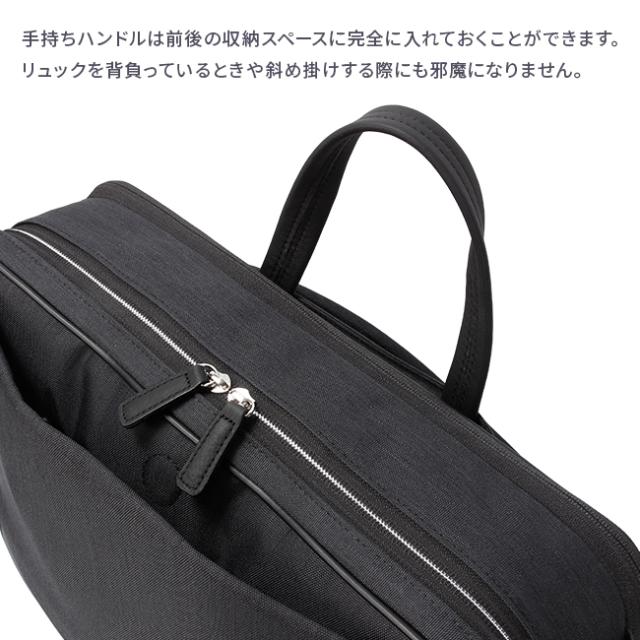 | ISIT 3WAYビジネスバッグアップデートモデル エコ通勤やジャケットスタイルにも合う、イズイットのA4ビジネスバッグ。ビジネスリュックにもなる3WAY仕様。エキスパンダブル仕様でマチが拡大し、1泊2日の出張にも対応した大容量なビジネスバッグです。イズイットのロゴプレートと、オレンジラインでブランドらしさを表現しています。 豊富な収納ポケットで、ビジネスに必要なあらゆる荷物の持ち運びが可能です。A4ファイルがすっぽり収まるメインコンパートメント内には、ファスナーポケットが1つ、大中小のポケットが1つずつ装備されています。細かな荷物を整理して収納が可能です。また、ビジネスバッグの前面にはアオリポケットがあり、新聞やサッと取り出したい小物の収納に便利です。フロントのファスナーポケットは浅型に設計しており、さらに内側はパイル生地を使用することで、スマートフォン等を入れても画面を傷つける心配がありません。 |