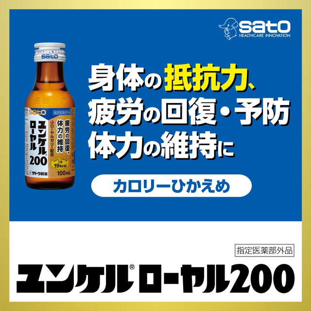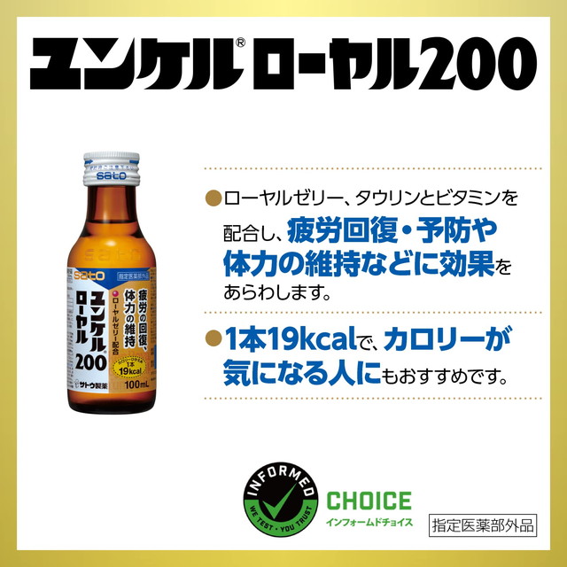 商品名 ユンケルローヤル200 100mL×10本×2個セット 【指定医薬部外品】 佐藤製薬 メーカー 佐藤製薬 容量 100mL×10本×2個セット 成分 1本(100mL中)ローヤルゼリーチンキ200mg(ローヤルゼリー200mgに相当)、ビタミンB1硝酸塩10mg、ビタミンB2リン酸エステル5mg、ビタミンB6 10mg、ニコチン酸アミド20mg、無水カフェイン50mg、タウリン1,000mg