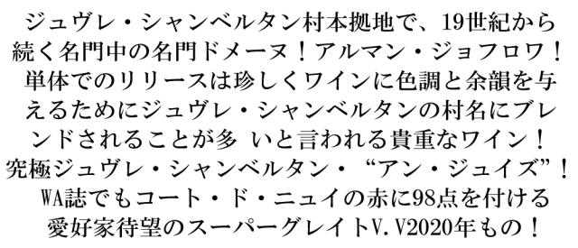 ジュヴレ・シャンベルタン村本拠地で、19世紀から 続く名門中の名門ドメーヌ!アルマン・ジョフロワ! 単体でのリリースは珍しくワインに色調と余韻を与 えるためにジュヴレ・シャンベルタンの村名にブレ ンドされることが多 いと言われる貴重なワイン! 究極ジュヴレ・シャンベルタン・“アン・ジュイズ”! WA誌でもコート・ド・ニュイの赤に98点を付ける 愛好家待望のスーパーグレイトV.V2020年もの!