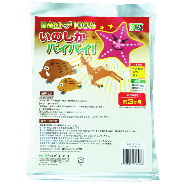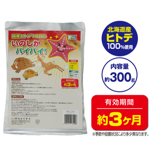 【品名】国産ヒトデ100% いのしかバイバイ!【内容量】300g【成分】北海道産ヒトデ100%【生産国】日本製【メーカー】メイダイ