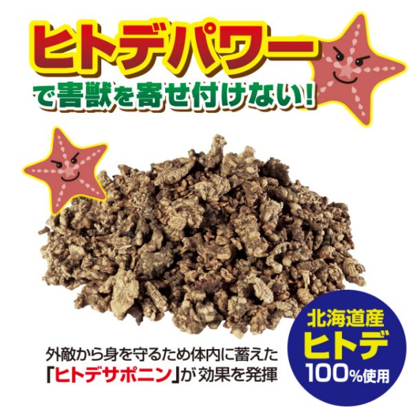 害虫・害獣が出そうな場所へ!困った害虫・害獣を寄せ付けない!猪や鹿の大嫌いな臭いを天然素材、国産ヒトデを乾燥粉砕して作りました。ホタテ漁で一緒に上がる天然ヒトデを乾燥(粉末化)・粉砕し、外敵から身を守るため体内に蓄えた「ヒトデサポニン」が効果を発揮する忌避剤です。■マウス、メダカに対する毒性検査にて安全性確認済み!■対象に合わせて使い方3通り(直接散布、吊るす、上澄み液をスプレー)■困った害獣イノシシ、鹿に。ハト対策にもなります。