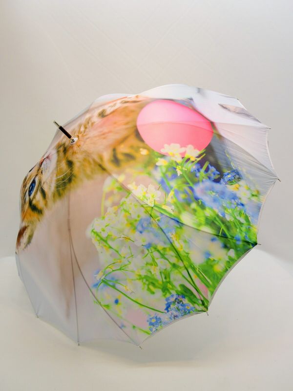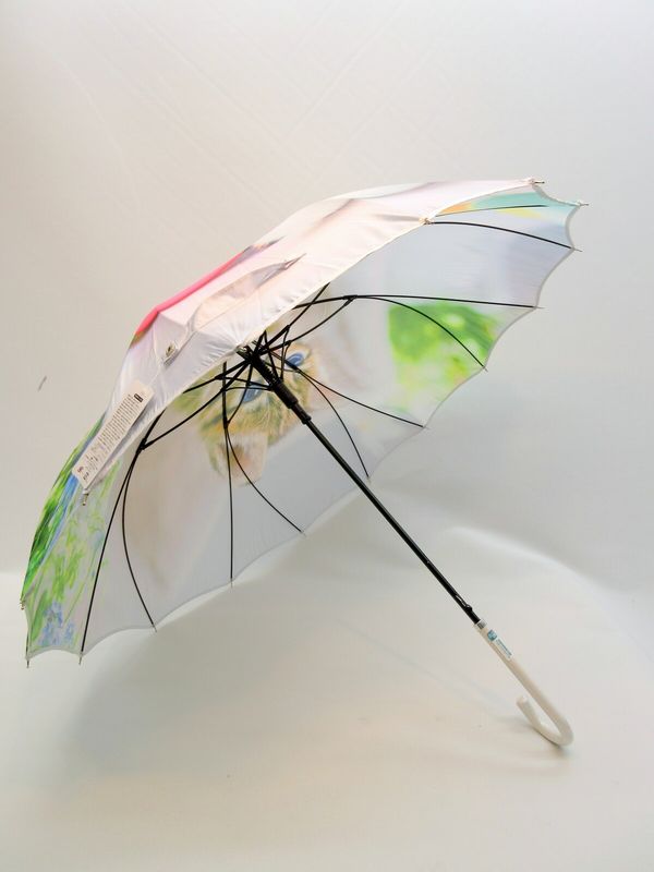 | 開くと花が咲いたようなシルエットの人気のサンフラワー骨を使用したジャンプ雨傘です。枝分かれ式の16本骨サンフラワー骨はその名の通り花のようで内側もオシャレです。 卵と花の組み合わせが可愛いイースター猫柄。 一枚張りだから雨漏りの心配を軽減し、一枚張りだからできる柄の途切れないデザイン性の高い雨傘です。 |