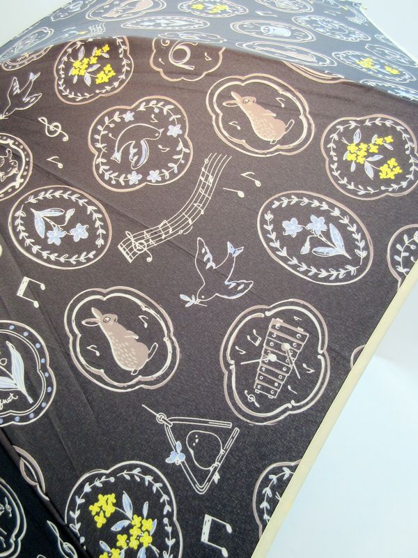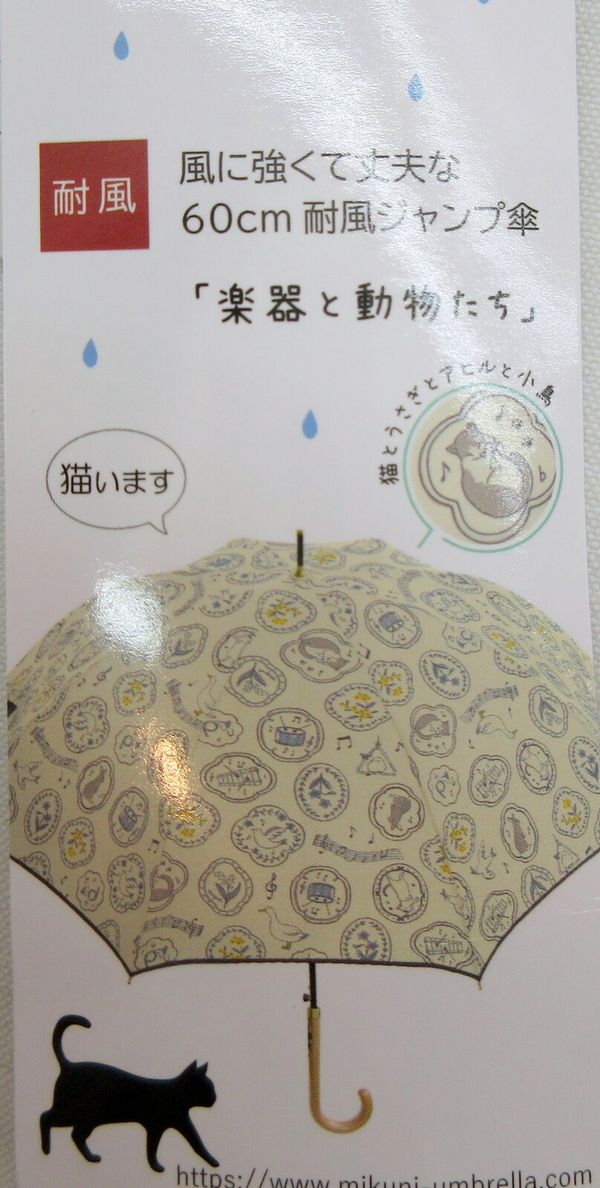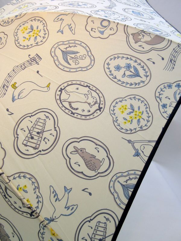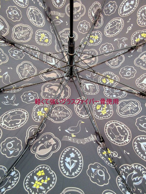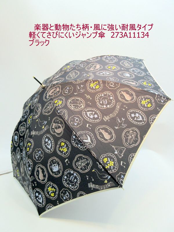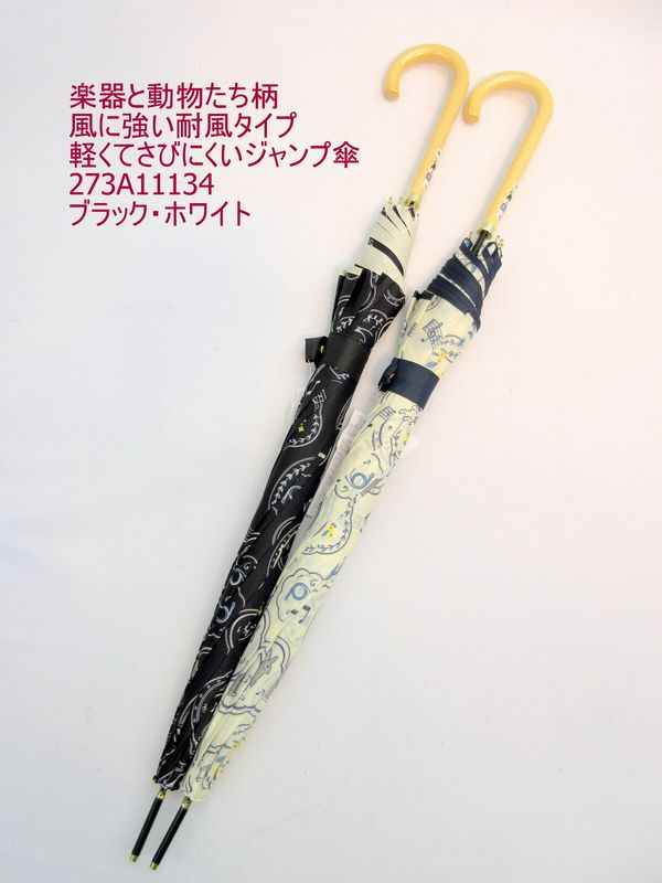 風に強くて丈夫な耐風骨使用タイプのジャンプ雨傘です。可愛らしい楽器と動物たち柄。