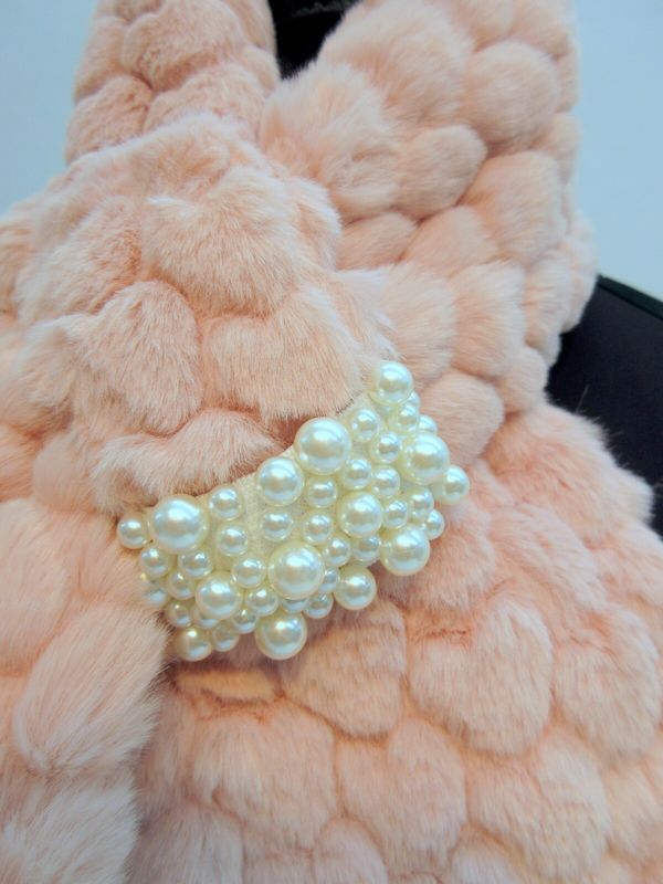 ファーひとつひとつがハート型になったキュートなフェイクファーマフラーです。キラキラのパールビジューの輪に片方を通すだけで簡単に巻くことができます。