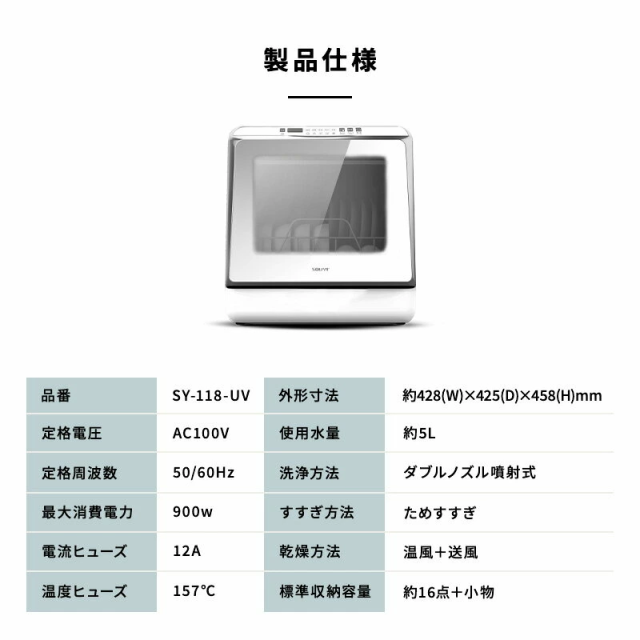 食洗機 食器洗い機 食器洗い乾燥機 食器洗い乾燥機 SY-118-UV 工事不要 据え置き型 タンク式 UV食洗機 3人用 3人暮らし ダブルノズル噴射式 高圧温水 高温水洗浄 UV 除菌 清潔 節水 節約 乾燥 洗浄 卓上 キッチン 時短 水洗 あらいもの 新生活