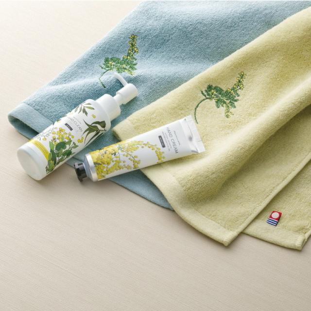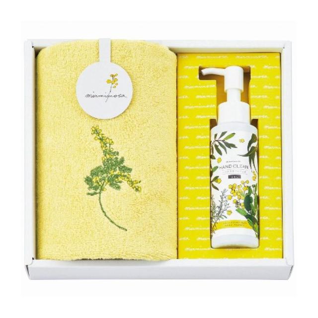春を告げる花ミモザをモチーフとした今治タオルと、保湿成分ヒアルロン酸と、香料(ティーツリー・ユーカリ・ニアウリ・ラヴィンサラ・ミモザ)のアロマ精油を配合した、ほんのりとアロマの香り漂うハンドクリーンジェルのセットです。