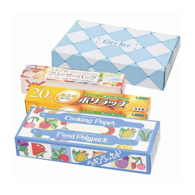 ポリラップ(22cm×20m)1本・フリーザーバッグ(5枚入)・クッキングペアセット(キッチンペーパー・ポリ袋各10枚入)各1箱・[日本・中国・タイ製]