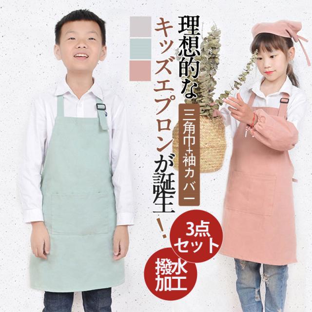 【水曜日まで!10%クーポン配布中】 キッズ エプロン 子供 三角巾 袖カバー 3点セット おしゃれ こども 小学生 小学校 低学年 高学年 男の子 女の子 無地