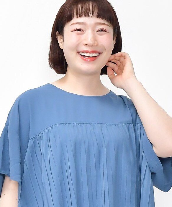 首元はかぶりデザインなのに 印象をキュッと小さく見せられる技を効かせた一枚。