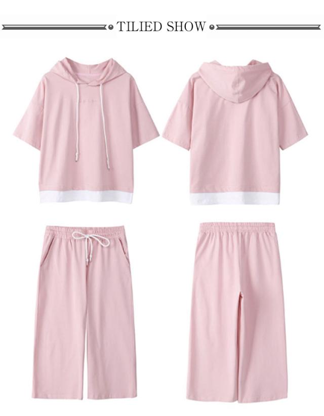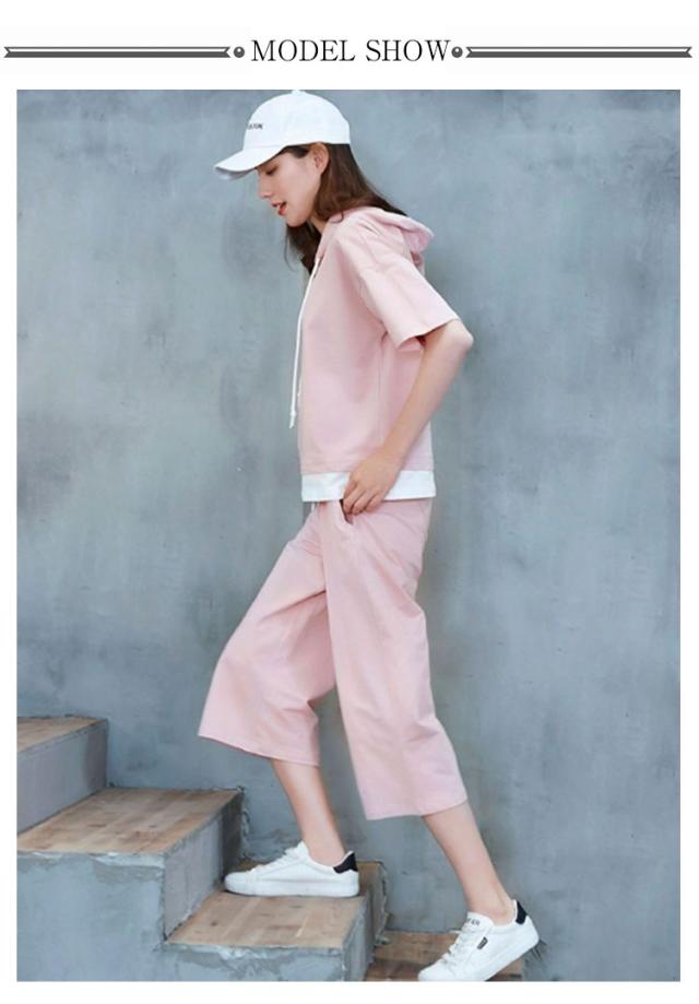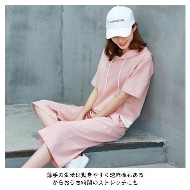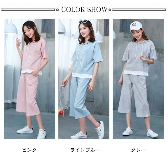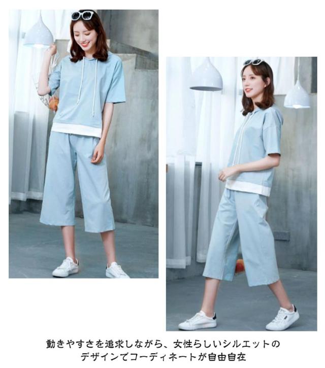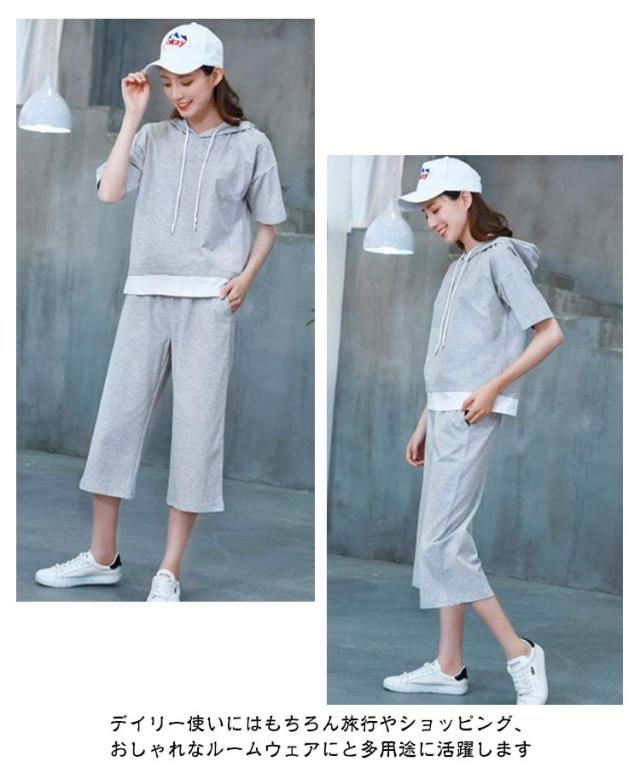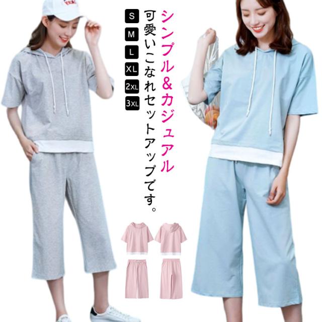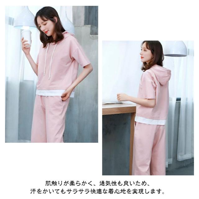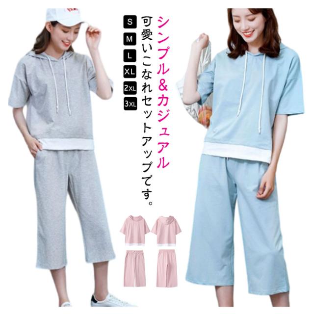 レディース パンツ 夏 プルオーバー 上下セット 半袖 2点セット ロング 七分丈パンツ スウェット セットアップ 大人 フードパーカー パンツスーツ 半袖 セットアップ トップス Tシャツ+パンツ 上品 セットアップ かわいい きれいめ カジュアル 春 夏