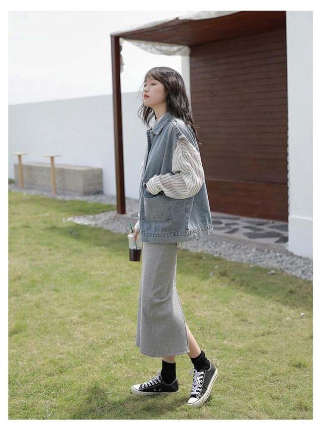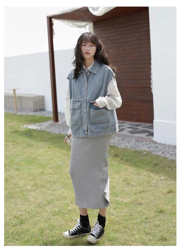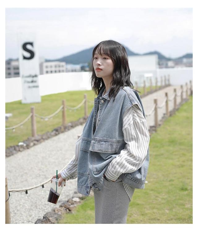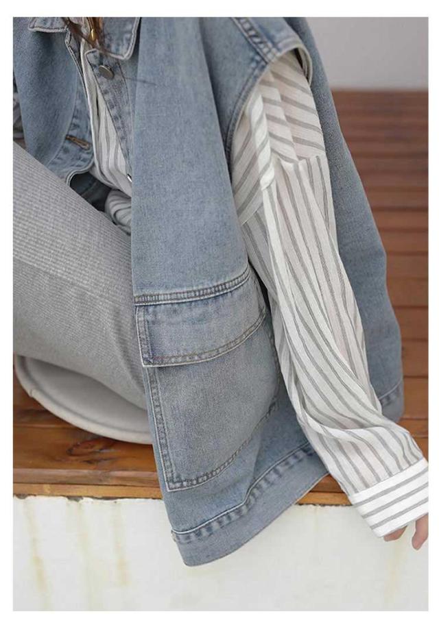 | ゆったりとしたノースリーブデニムジャケットです。 大きなフロントポケットもかわいらしさを引き立てるポイント。 前を開けて羽織りにしたり、ワンピースのように着たりと様々な着こなしができ、着回し力の高さも魅力的。 | |