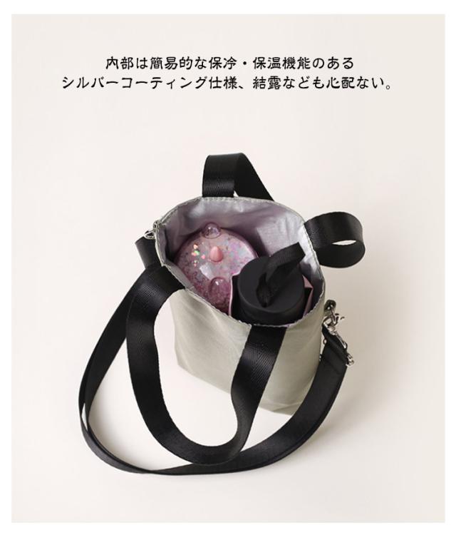 | スマホなど小物も入れるビッグボトルホルダー。 スマートフォンやや鍵も収納できるフロントファスナーポケット付き、運動会やお散歩、お出かけなど時これ一つで便利。 内部は簡易的な保冷・保温機能のあるシルバーコーティング仕様、結露なども心配ない。表地は撥水加工を施しているので、水や汚れが付きにくい。 大きいサイズの方は傘と水筒同時入れるから、日傘、スマホ、ペットボトルなど一つにまとめて収納して、お散歩のお供ピッタリです。 メイン収納ポケットはすぐに取り出しやすいスナップボタン仕様になっています。 肩紐は長さ調整できます。肩掛けしたり、斜めがけしたりできるから、ハンズフリーでお出かけ。 | |