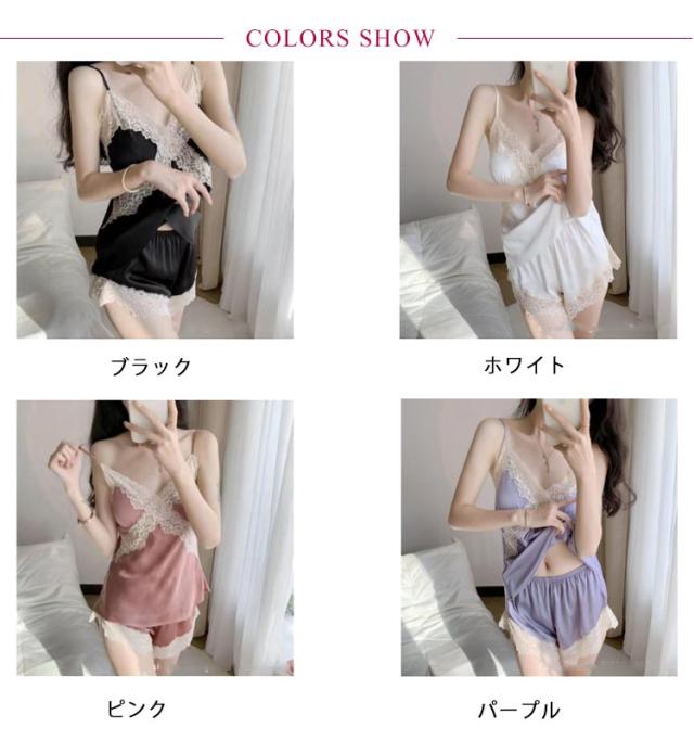 | 光沢感のあるサテン素材のキャミソールとショートパンツの2点セットルームウェアです。 大人可愛いデザインでルームウェアとしてもオススメです。 のんびり、リラクゼーションに最適で、仕事で疲れた一日の後に着用するのに最適です レース切り替えと女性らしさを演出。 ナイトウェア、デザイン良くて作りも素敵です。柔らかな滑らかなソフトで快適な肌触り感!良質な睡眠も幸せ感も満点です。 | |