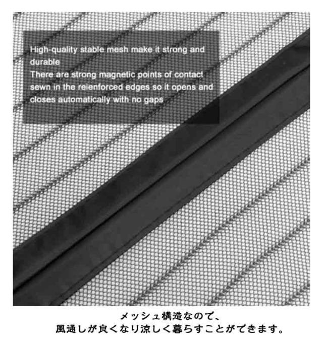 | 【網戸カーテン】【風通し 虫よけ】【7サイズ】 玄関カーテンは蚊、ハエ、虫などが気になる季節の必要品です。 メッシュ構造なので、風通しが良くなり涼しく暮らすことができます。 強力マグネットで、手を使わなくても、自動閉めることができます。 付属のマジックテープだけで簡単に取り付きができ、女性の方でも簡単に操作できます。 | |