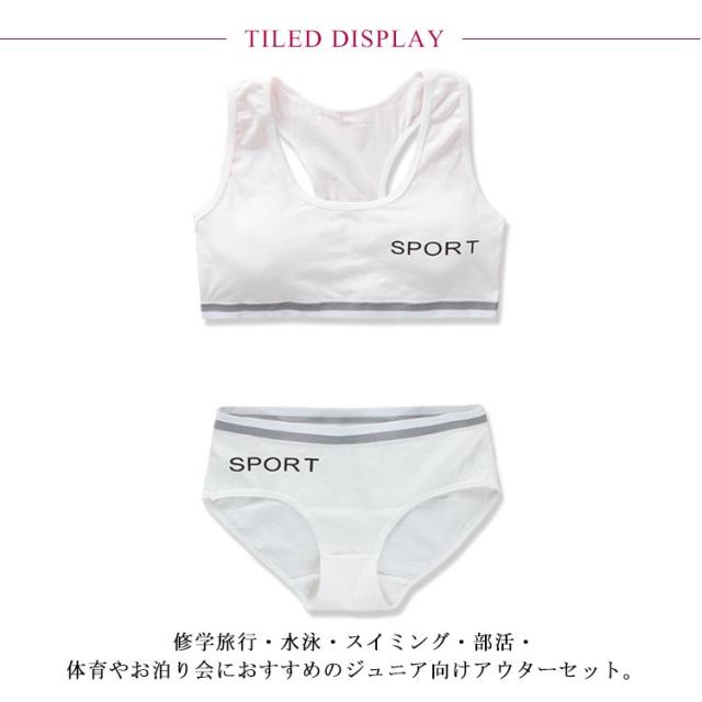 | 小学生高学年〜中学生向け女の子用下着セット。スポーツブラとパンツの上下2点セットです。 修学旅行・水泳・スイミング・部活・体育やお泊り会におすすめのジュニア向けアウターセット。 シンプルでおしゃれな人気の英字ロゴテープデザインがポイント。 伸縮性のあるノンストレスな着心地。体にピッタリフィットして揺れないのでダンス衣装のインナーとしても大活躍! 見えてもかっこいい英字肩紐のスポブラなので、ブラジャーはまだ早いキッズのチューブトップやブラトップとしても安心して着用いただけます。 | |