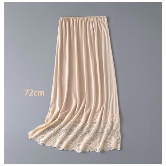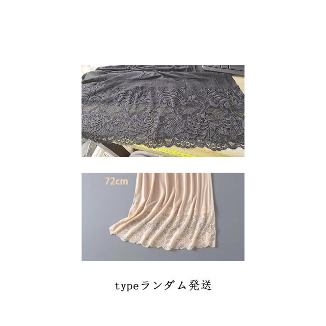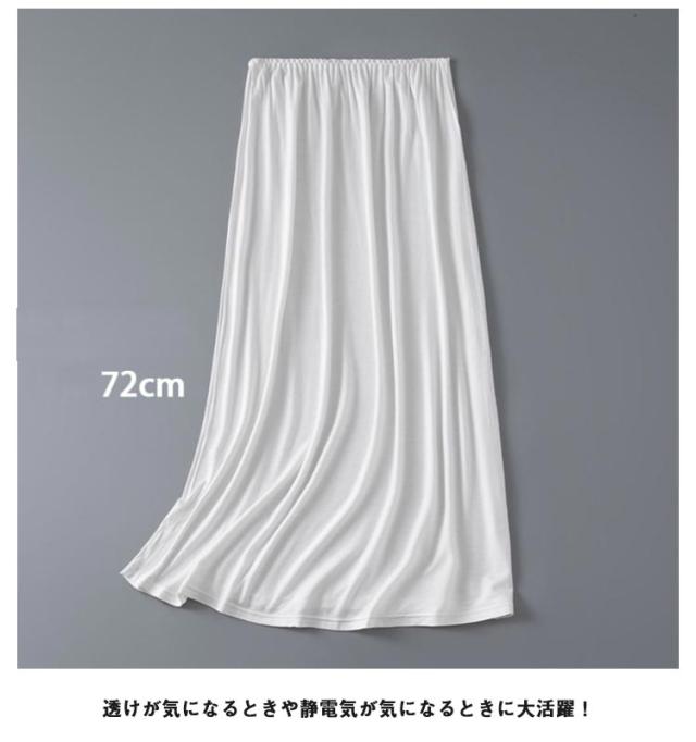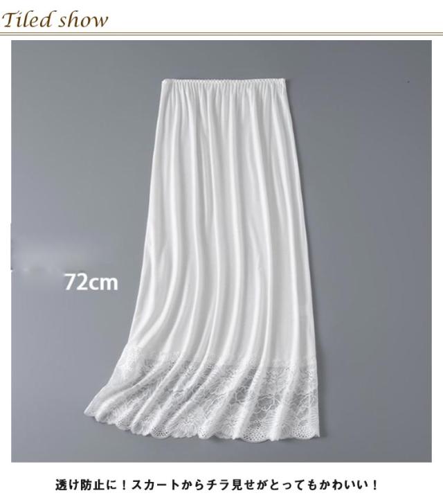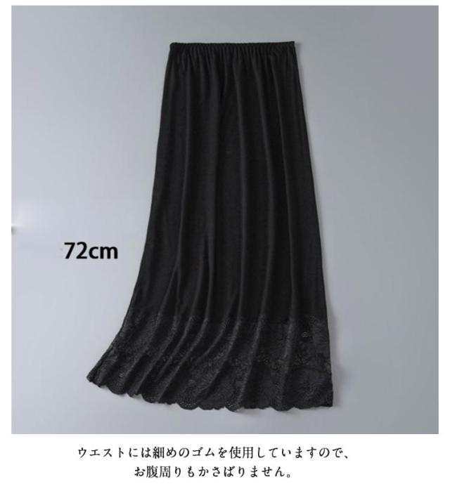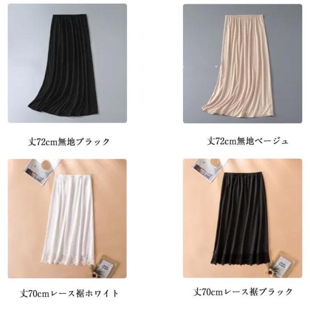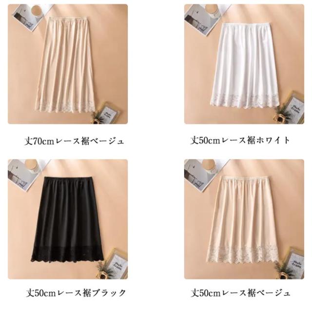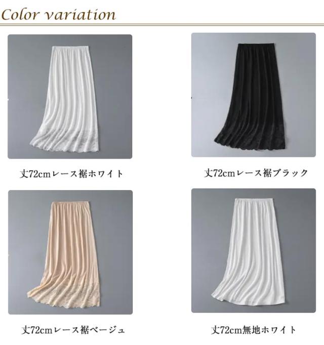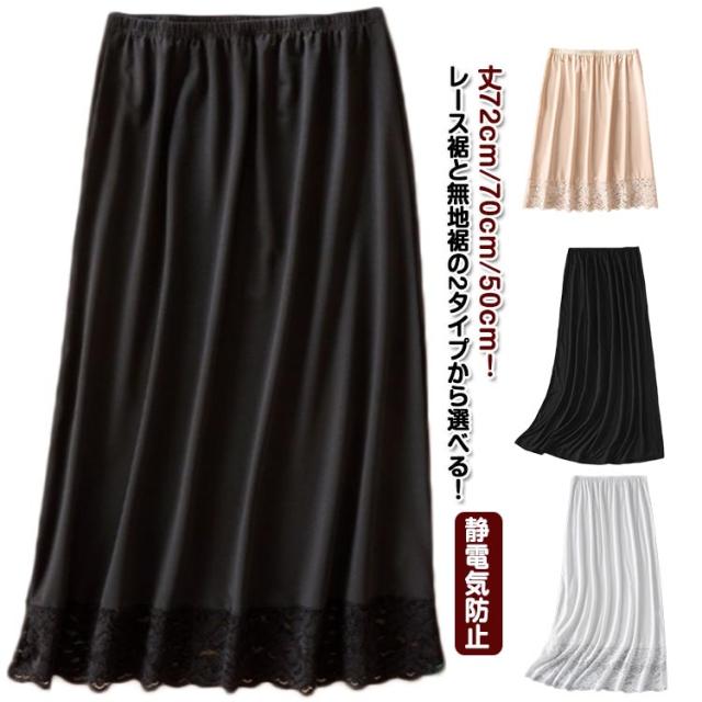 | 丈72cm/70cm/50cm!レース裾と無地裾の2タイプから選べる! 透け防止に!スカートからチラ見せがとってもかわいい! ウエストには細めのゴムを使用していますので、お腹周りもかさばりません。 透けが気になるときや静電気が気になるときに大活躍! | |