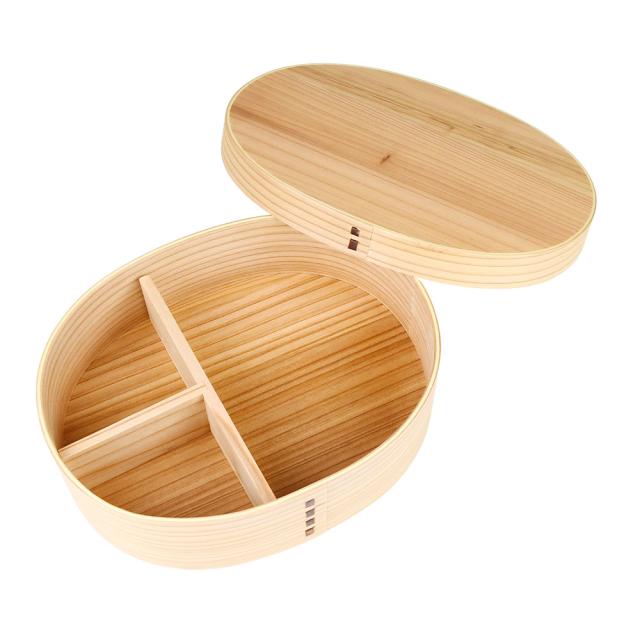 シンプルな小判型の使いやすいデザインの大きめかぶせ蓋曲げわっぱです。容量は850mlとたっぷりサイズですので、よく食べる方にも満足いただける大きさになっております。T字の仕切りがついており、取り外しができますので、衛生的にお使いいただけます。