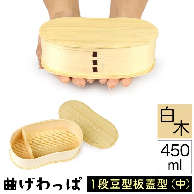 丸みのあるフォルムが可愛いコンパクトなサイズ感の一段豆型板蓋型(中)曲げわっぱ弁当箱になります。450mlと小さめのサイズになりますので女性やお子様、少食の方やダイエット中の方にもぴったりです。一文字の仕切り板がついており、取り外しができますので、衛生的にお使いいただけます。