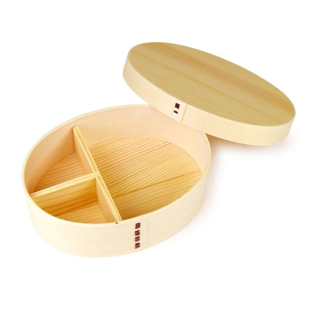 コロンとした丸みが可愛い小判型の曲げわっぱとなります。容量は750mlとしっかり大きめのサイズ感になっておりますので、老若男女問わず、比較的よく食べる方にも満足していただけます。ミニサイズのお櫃がわりにご使用いただくことも可能です。T字の仕切りがついており、取り外しができますので、衛生的にお使いいただけます。