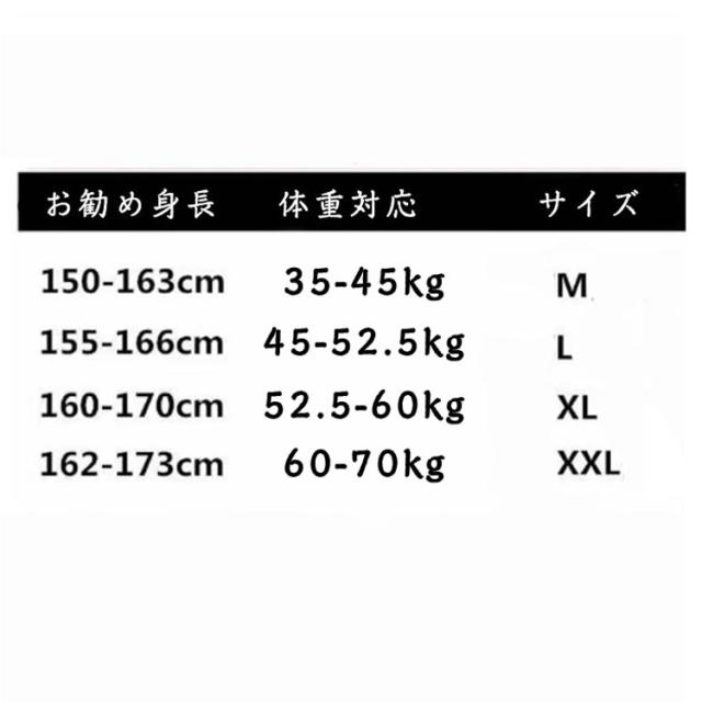 | サイズについての説明 | M:体重45-50kgの方におすすめ L:体重50-55kgの方におすすめ XL:体重55-60kgの方におすすめ 2XL:体重60-65kgの方におすすめ |