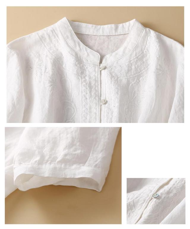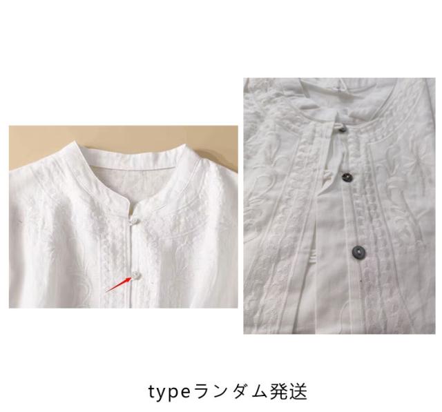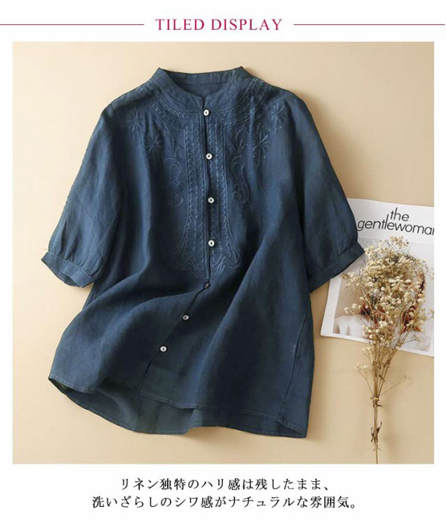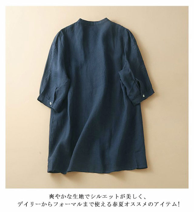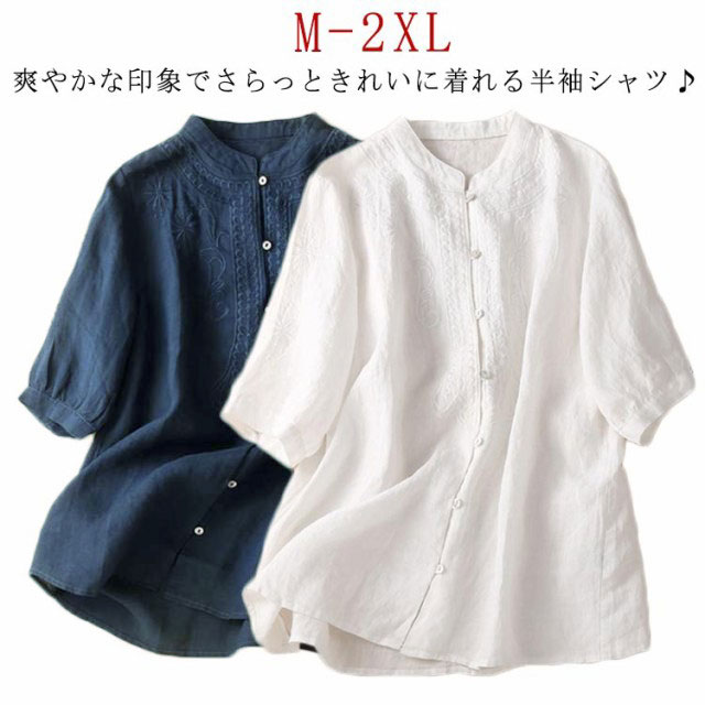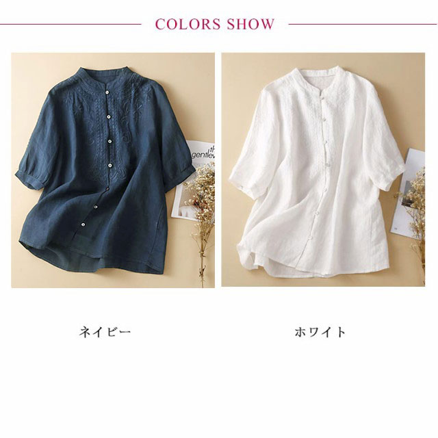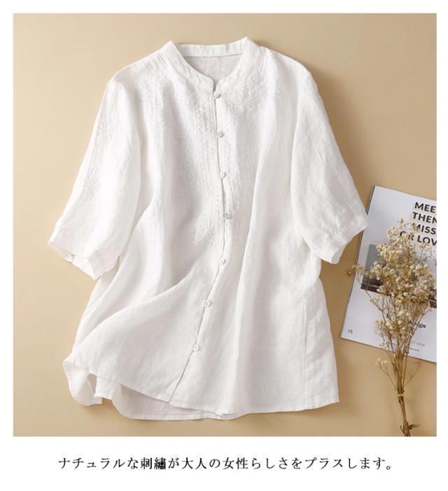 シャツ ブラウス 綿麻ブラウス レディース 半袖 春 夏 刺繍 花柄 トップス スタンドカラー 大きいサイズ ゆったり チュニック 七分袖 ナチュラル 綿 コットン コットンシャツ 白シャツ シャツ 大人シャツ おしゃれ Tシャツ