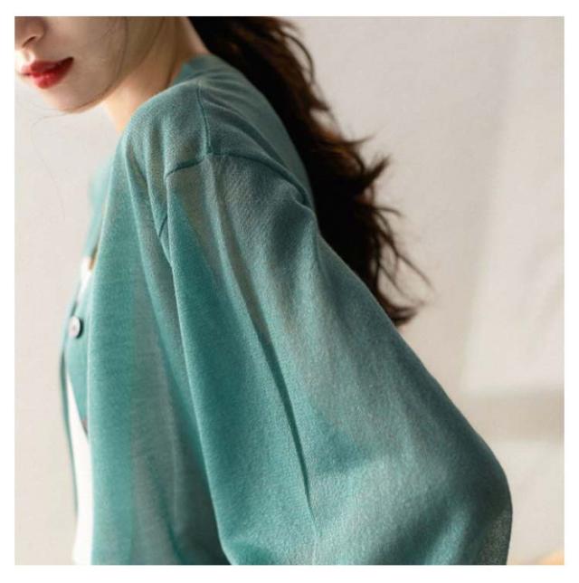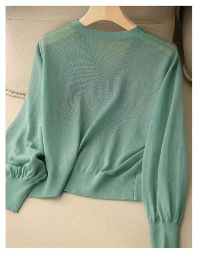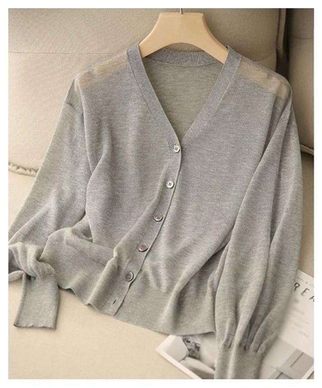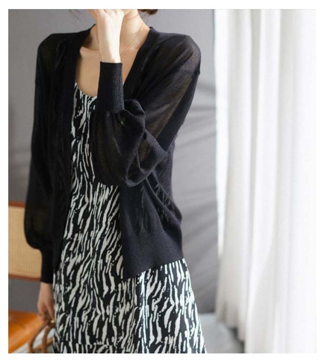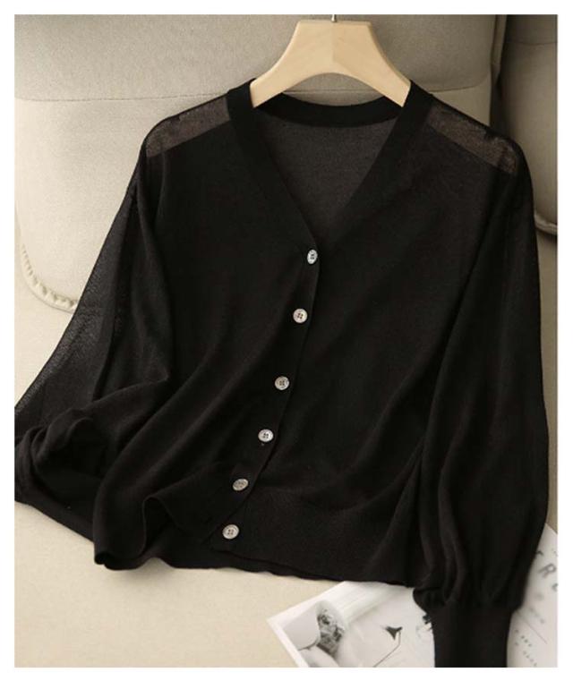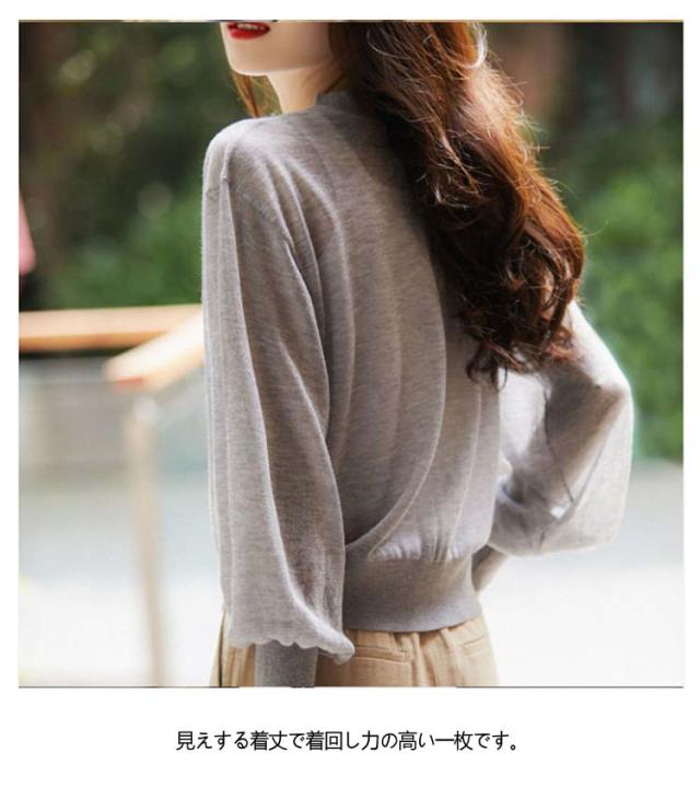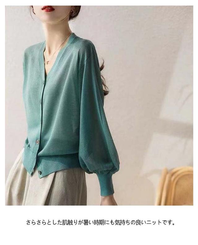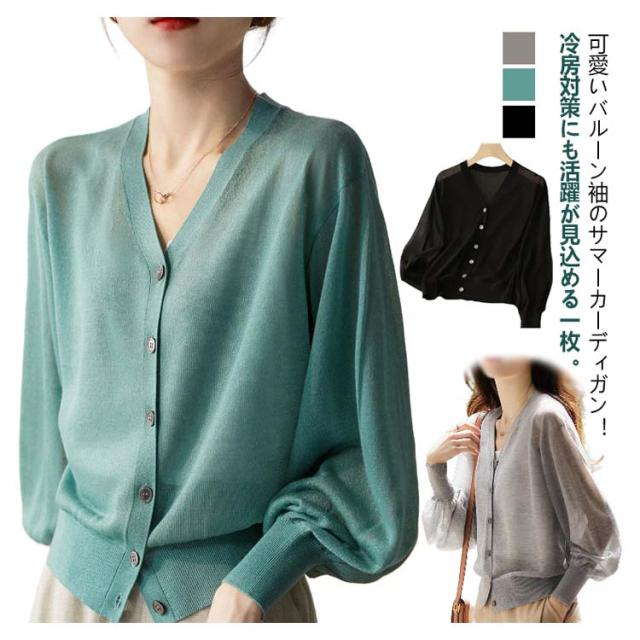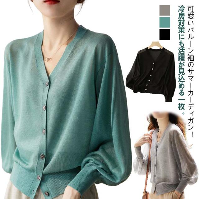 バルーン袖 カーディガン 薄手 夏 レディース Vネック サマーカーディガン サマーニット ニットカーディガン ニットトップス 接触冷感 前開き 長袖 冷房対策 羽織り 春 夏 韓国ファッション S M L XL 2XL 3XL