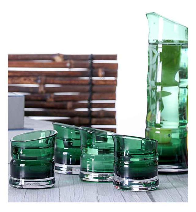 | 竹の形のガラス製おちょこセット。 セット内容:徳利*1、お猪口*2 ガラスの透明感とハンドメイドならではの味わいのある手触りで、より一層お酒を楽しむことができます。 普通の酒器よりやや厚みがあるので、丈夫で、割れにくく普段使いようにピッタリです。 容量は270ccと1合に満たない量の日本酒が入ります。 晩酌用に来客用に、常備したい基本セット。 | |