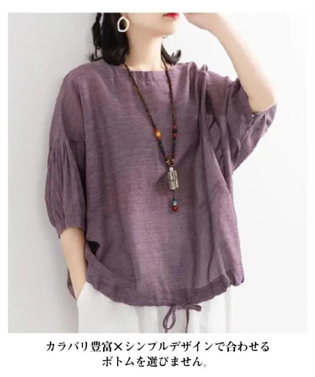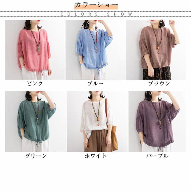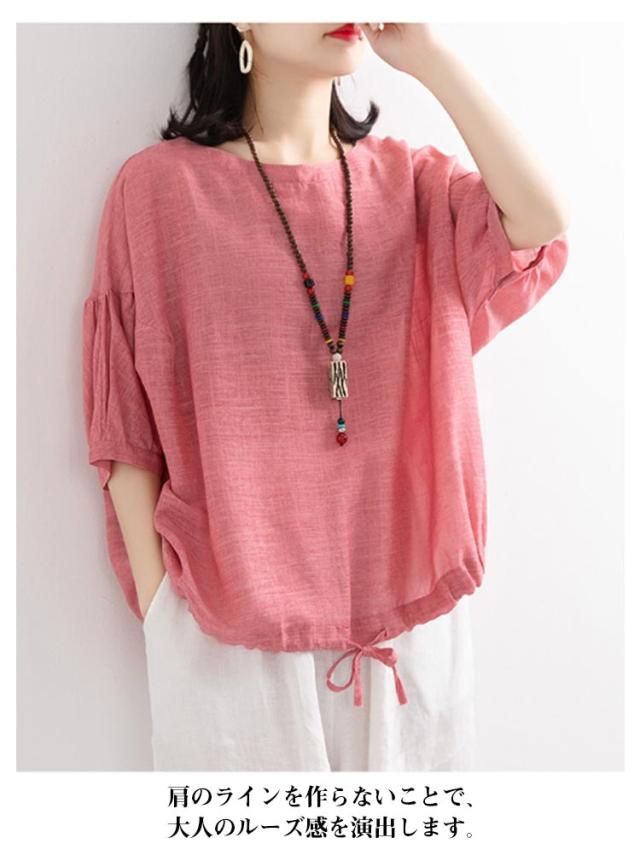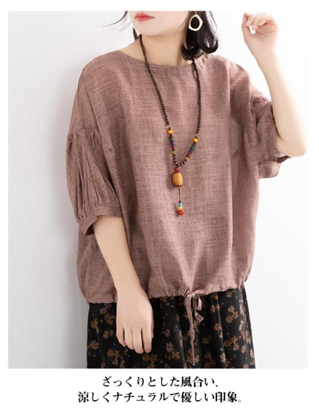 プルオーバー カットソー 半袖 大きいサイズ レディース Tシャツ ゆるふわ トップス 二の腕カバー ドルマンスリーブ ボリューム袖 プルオーバー 裾リボン ピンク ブルー ブラウン グリーン ホワイト パープル