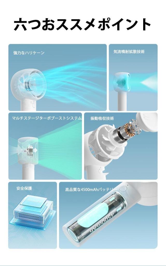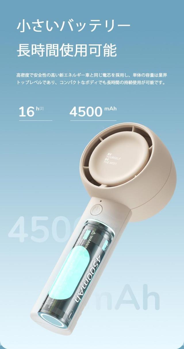 4500mAhのバッテリーを内蔵され、容量も十分ありますので、充電頻度も少なくて済むこのハンディ扇風機は弱-中-強の3段階風速モードがあり、風量切替ボタンを押すたびに、自分に適切な風速モードを選べます。市場の他製品と違い、風のムラを大幅に減らし、最大20%の風量アップに成功、もっと優しい風になり、涼しい風を送風しながら仕事や勉強も集中できる。