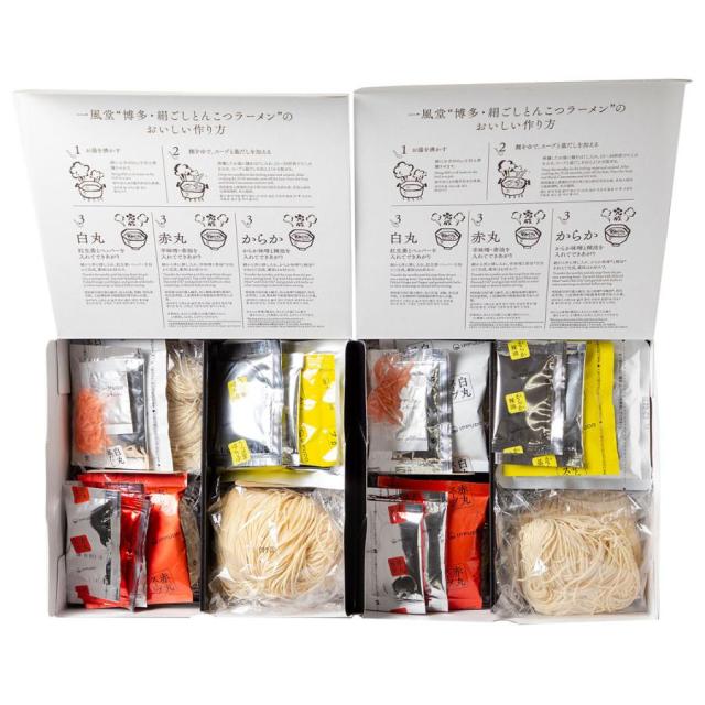 一風堂の定番メニューの『熟成なめらか白丸』と『濃厚コク旨赤丸』に豆板醤や甜麺醤などを独自に配合したからか味噌をトッピングした『超絶ウマ辛からか』を詰合せました。