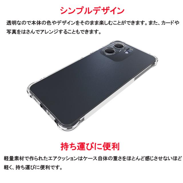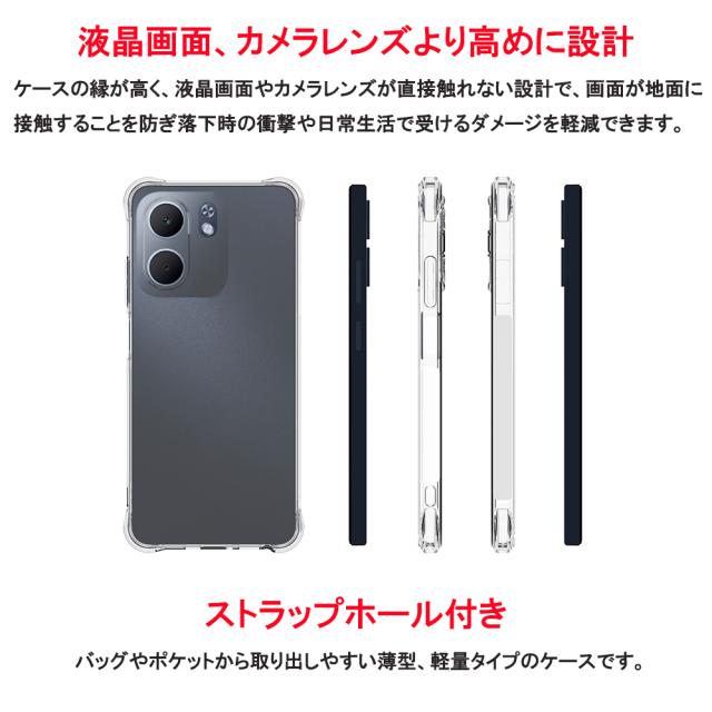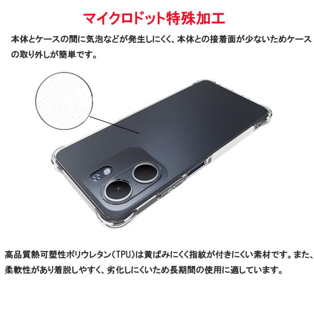 【特徴】 スリムデザイン バッグやポケットから取り出しやすい薄型、軽量タイプで持ち運びに便利です。 四隅エアクッション構造 ケースの四隅にエアクッションが施されているので、落下時の衝撃を緩和し、内部の部品やスクリーンを守ることができます。 液晶画面、カメラレンズより高めに設計 ケースの縁が高く、画面が地面に接触することを防ぎ落下時の衝撃や日常生活で受けるダメージを軽減できます。 高品質TPU素材使用 黄ばみにくく指紋が付きにくい素材です。また、柔軟性があり着脱しやすく、劣化しにくいため長期間の使用に適しています。 シンプルデザイン 透明なので本体の色やデザインをそのまま楽しむことができ、カードや写真をはさんでアレンジすることもできます。 マイクロドット特殊加工 本体とケースの間に気泡などが発生しにくく、本体との接着面が少ないためケースの取り外しが簡単です。