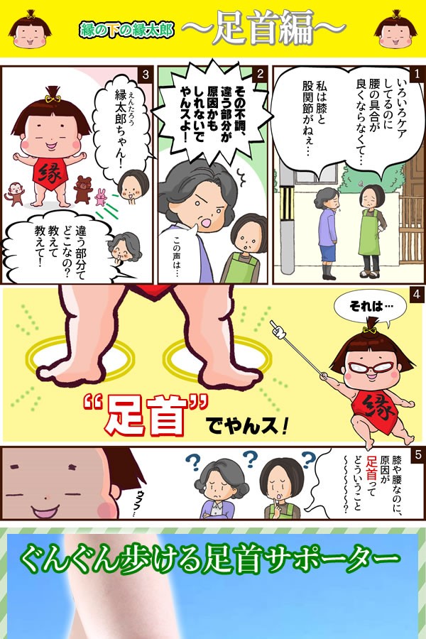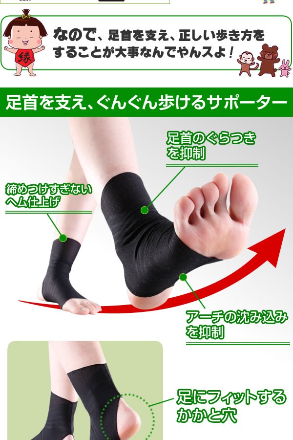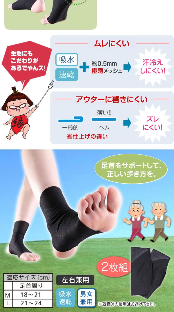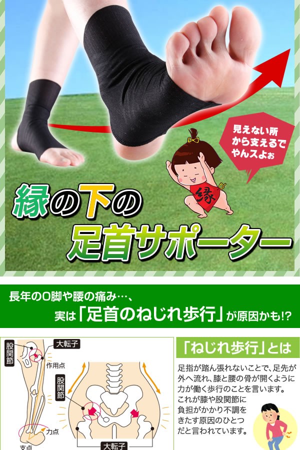 | 膝や腰の不調は足首が原因かも?足首をサポートするなら「縁の下の足首サポーター」!吸水速乾生地でいつでも快適。約0.5mmと薄いのにテーピング理論により、足首のブレを抑制して不快感を軽減。裾は締め付け過ぎないヘム仕上げ。足のクッションである土踏まずのアーチを持ち上げることで、足の動きがスムーズになり、疲れにくく、歩きやすくなります。 |