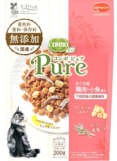4902112046524素材、本物にこだわり抜いた、混じりっけないピュアなおいしさ。気になる添加物は取り除き、本物を追求したブランド。着色料・香料・保存料無添加。下部尿路の健康維持に配慮した、低マグネシウム設計。(含有量0.08%:標準値)尿pHを弱酸性に調整し、ストルバイト結石に配慮。おさかなの旨みたっぷりのパウダーを贅沢に使用したまぐろ味粒。驚きのおいしさを実現しました。素材そのまま、栄養も損なわれない国産鶏肉フリーズドライと体にやさしい減塩小魚の本物にこだわり抜いたトッピング。オレイン酸を多く含み、クセがなく素材の旨みを引き出すオリーブの恵みピュアオイル。