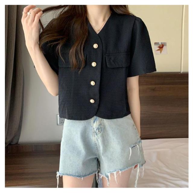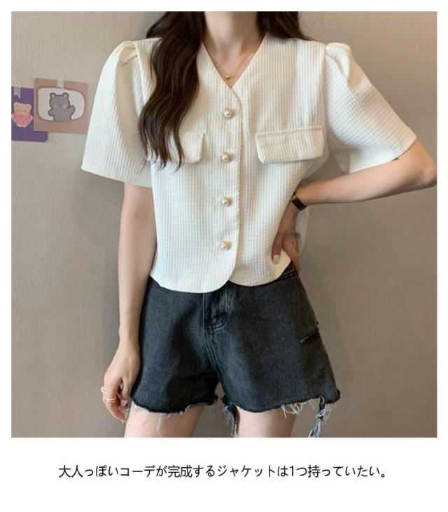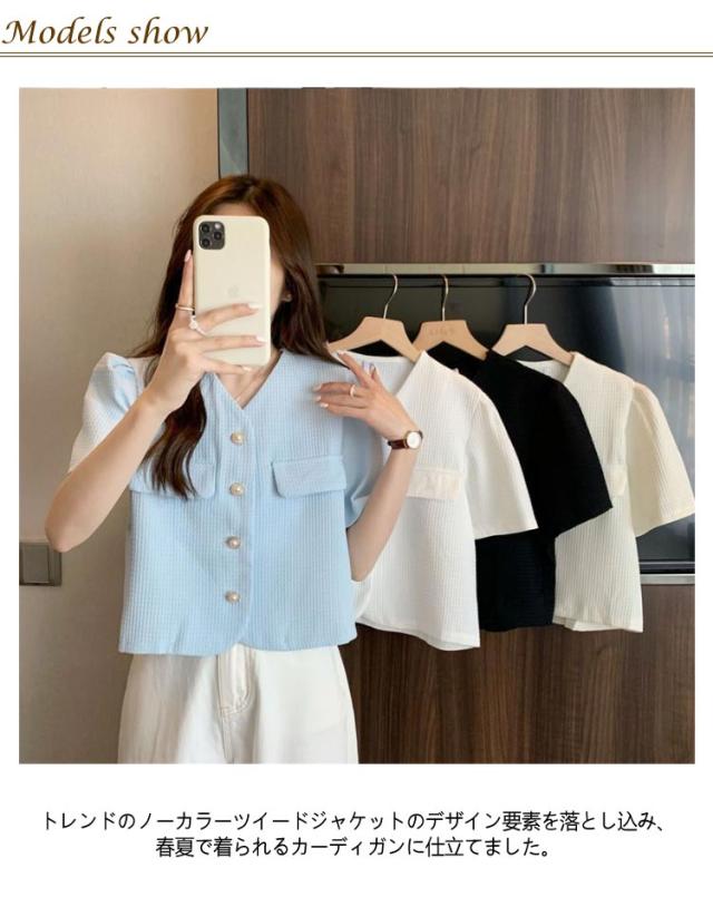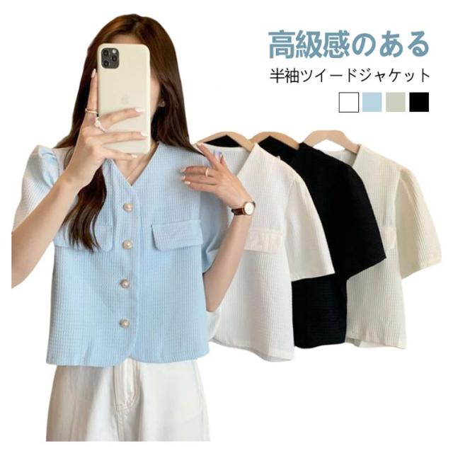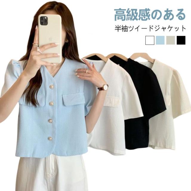 半袖ジャケット レディース ツイード風 ショート丈 半袖 半袖ジャケット 夏 お出かけ 無地 ノーカラー 韓国風 サマージャケット クロップド丈 着回し お出かけ カジュアル きれいめ 可愛い OL デイリー 結婚式