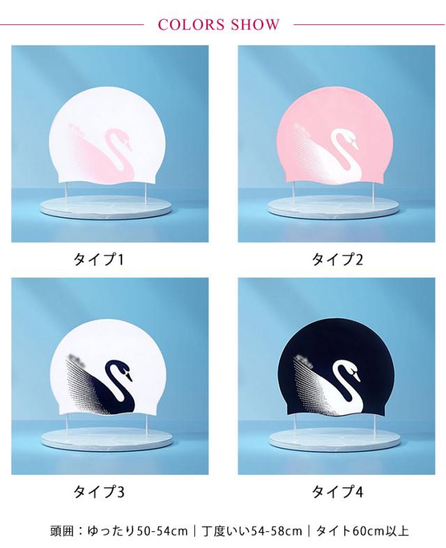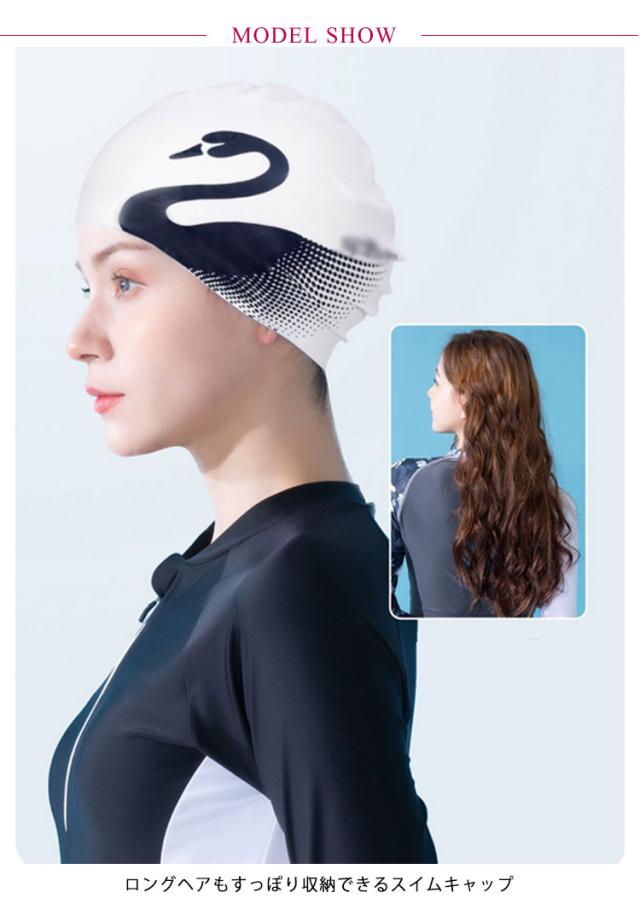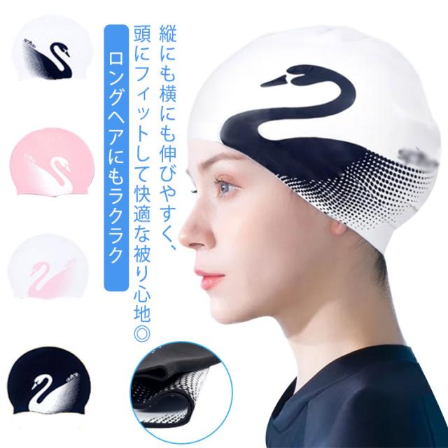 | 縦にも横にも伸びやすく、頭にフィットして快適な被り心地◎ロングヘアにもラクラク。 ロングヘアもすっぽり収納できるスイムキャップ 着脱が簡単で、耐塩素性に優れ、耐久性も抜群です。 水中ウォーキングなどのトレーニングや、キッズスイミングの付き添い、ベビースイミングなど、普段のプールで大活躍! いつもの水着のアクセントにGOOD♪可愛い白鳥柄があるので、プレゼントにもおすすめ。 | |