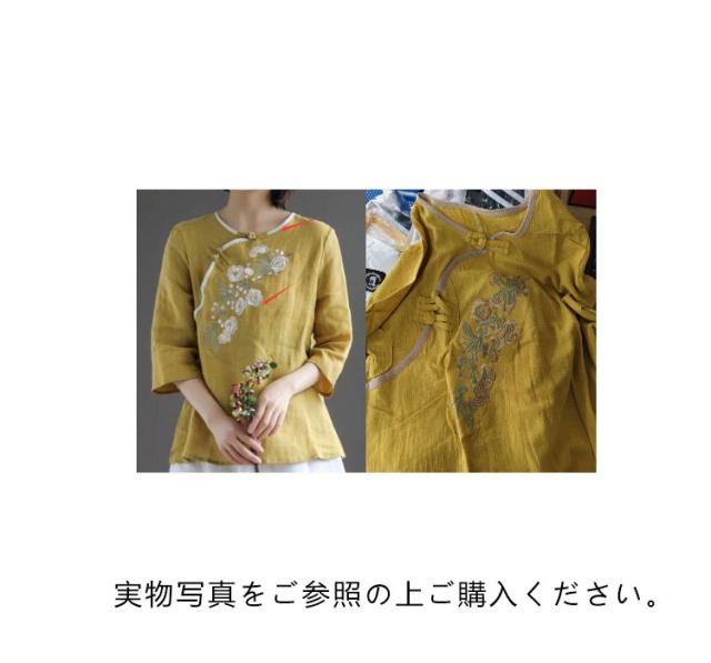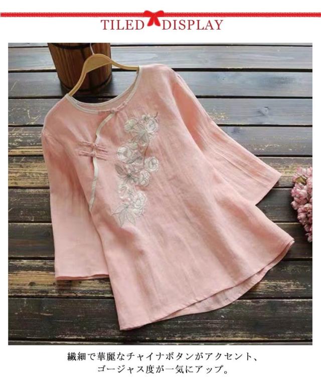 ブラウス レディース トップス 刺繍 チャイナ服 花柄 刺繍ブラウス 七分袖 綿麻 チュニック ゆったり ナチュラル かわいい 春 夏 母の日