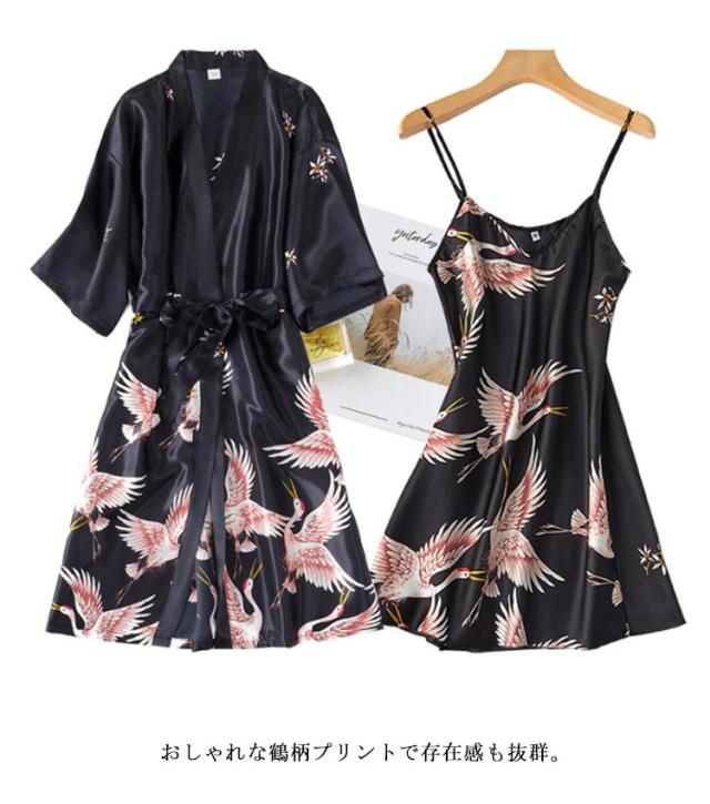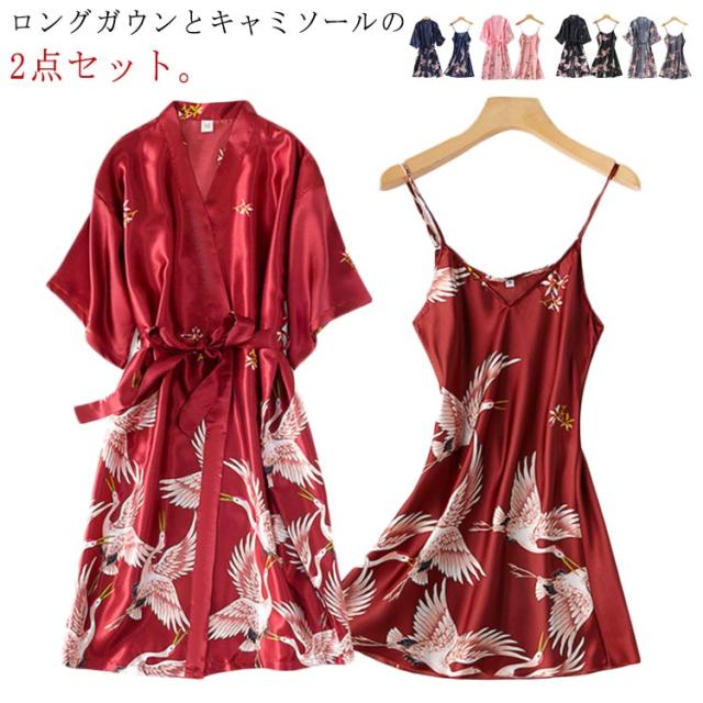ネグリジェ パジャマ ルームウェア アイスシルク サテン調 前開き ナイトウエア ロングキャミソール付き 2点セット Vネック ロングガウン 鶴柄 春秋夏 可愛い セクシー 母の日 ギフト
