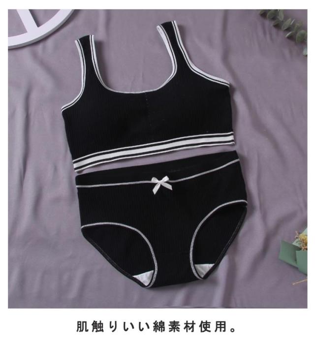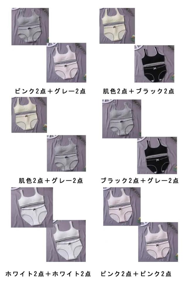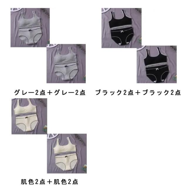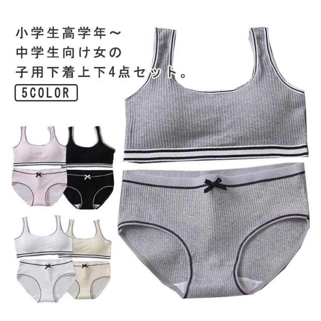 | 小学生高学年〜中学生向け女の子用下着上下4点セット。 肌触りいい綿素材使用。 伸縮性のあるノンストレスな着心地! ファーストブラにおすすめ、パット入りなので安心! 修学旅行・水泳・スイミング・部活・体育やお泊り会におすすめのジュニア向けアウターセット。 | |