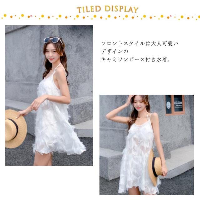 | ワンピース+セパレートビキニの水着3点セット! フロントスタイルは大人可愛いデザインのキャミワンピース付き水着。 大人可愛いフリル付きハイウエストビキニは細見えするディテールを組み込んだ1着。 | |