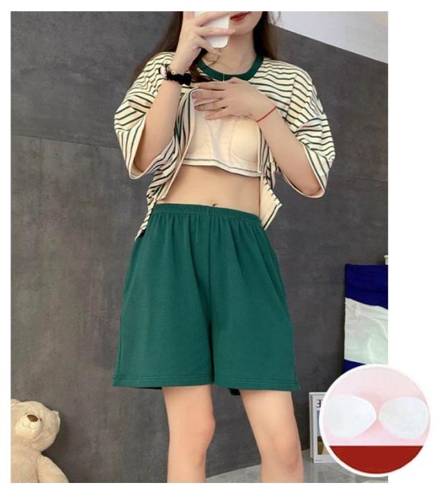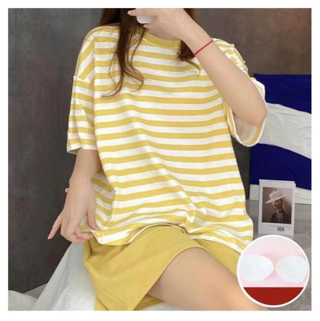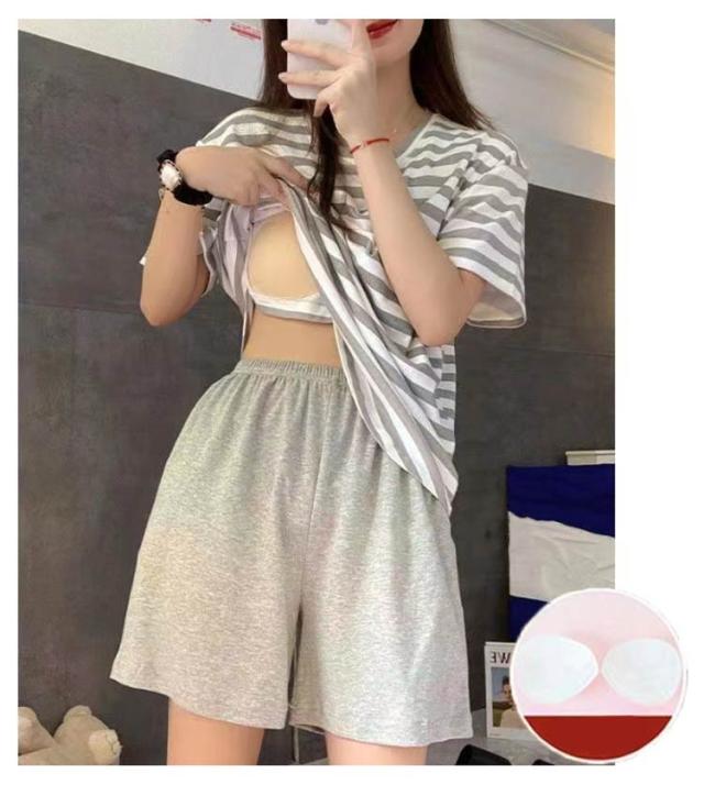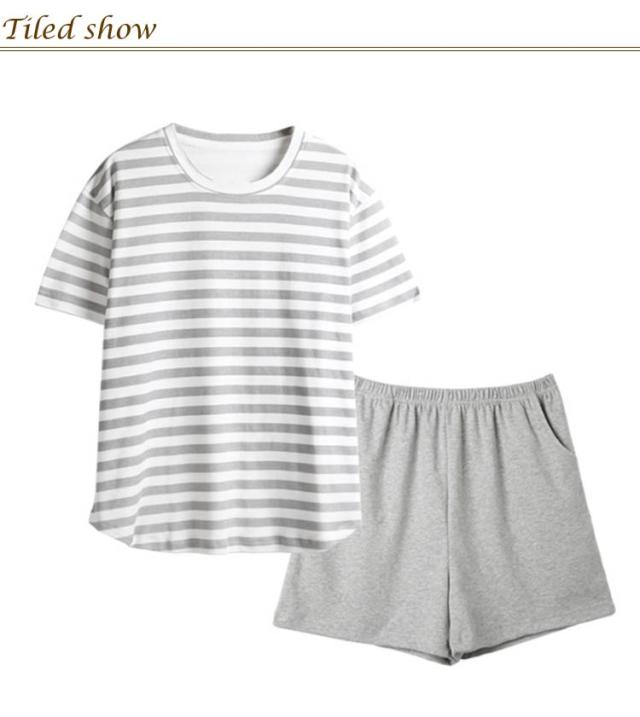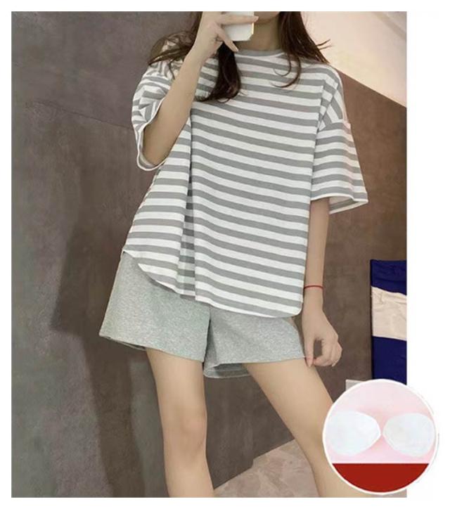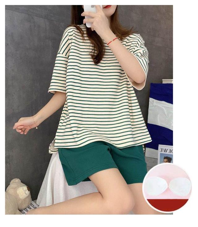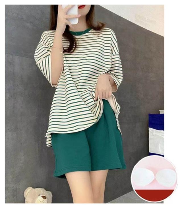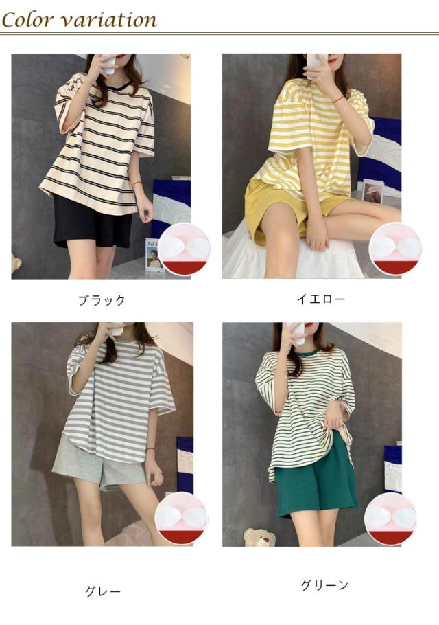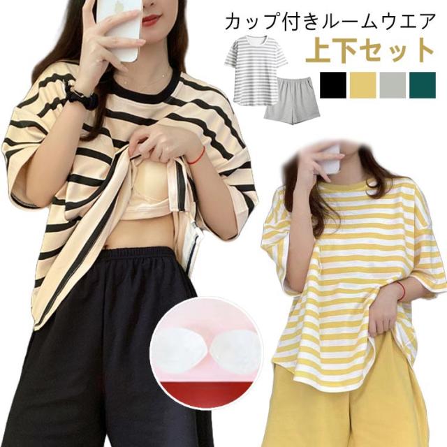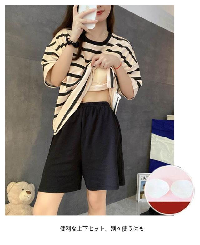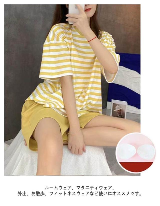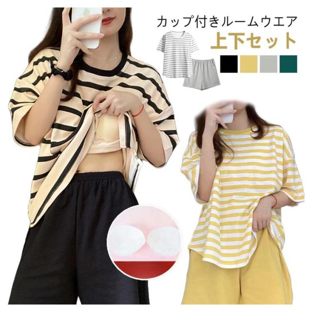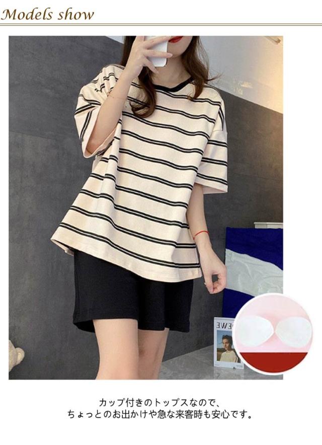 トップス 上下セット レディース ルームウェア 半袖 半袖 ルームウェア パジャマ プルオーバー セットアップ 部屋着 半袖tシャツ カップ付き ストライプ柄 ショートパンツ カットソー 薄手 大きいサイズ 半パン ウエストゴム 修学旅行 入院