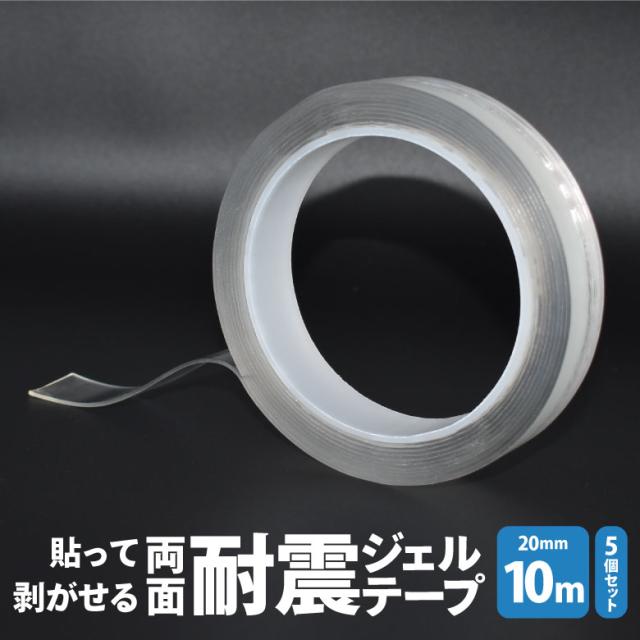 貼って剥がせる両面耐震ジェルテープ 20mm×10m 5個セット 透明両面テープ 超強力 はがせる 防災 地震対策 転倒防止 壁紙 透明 クリアテープ 強力テープ 浮かせる収納 壁面 床 棚上 繰り返し使える 便利グッズ HNZ
