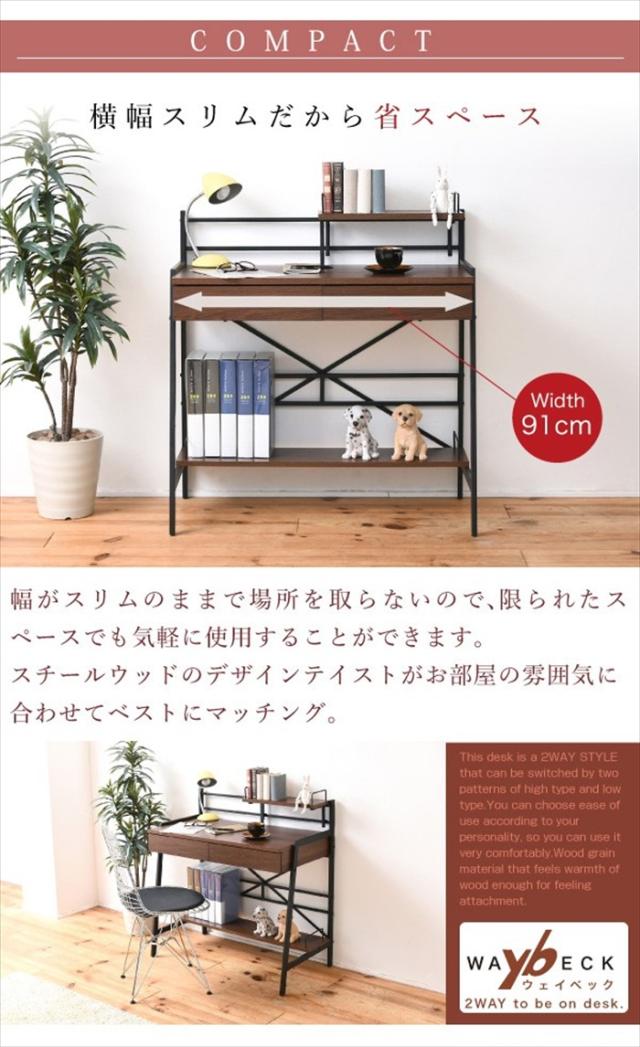| ハイ・ローの2wayで使用できるフレキシブルなデスクの90幅タイプ。 棚はひっかけるだけなので、左右はフリーにレイアウトできます。 本体にはメラミン樹脂シートを採用しているので、耐熱性・耐水性・耐傷性に優れています。 木目とスチールの組み合わせがスタイリッシュなデスクです。 |