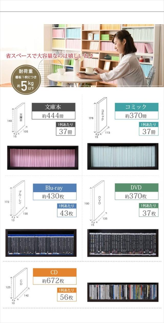 | □耐荷重 [可動棚]5kg以下 □収納量 [文庫本]444冊 [コミック]370冊 [DVD]370枚 [CD]672枚 [Blu-ray]430枚 |