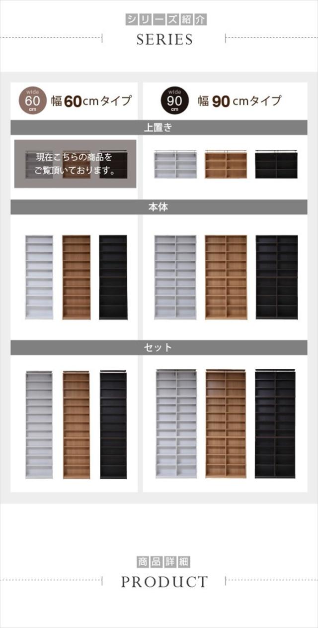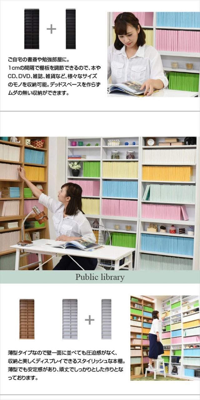 | 棚板を1cm間隔で調整できるので、本だけでなく、ディスプレイラックとして使える万能本棚。 お部屋に合わせて選べる60幅、90幅をご用意。 組み合わせて使えば、120幅、150幅としても使える大容量の文庫本ラック。 本体と合わせれば、本棚の上のデットスペースも有効活用! |