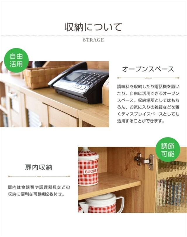 | カウンター下のスペースを活用する、カウンター下収納。 カントリーな雰囲気を醸し出す、木目調のデザインが美しいキャビネット。 オープンスペースには電話がおける広々空間。 食器棚としてもリビング収納としてもお使いいただけます。 |