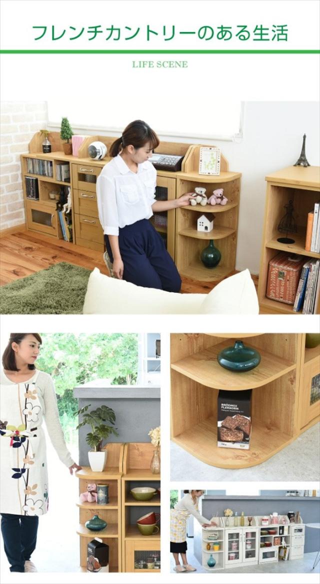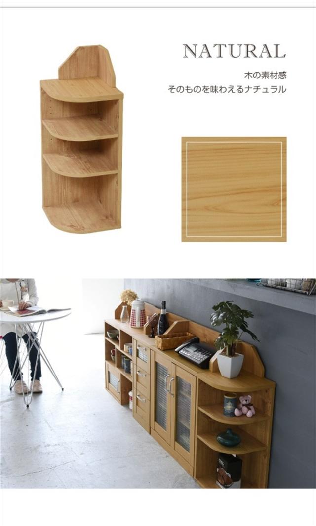 | カウンター下のスペースを活用する、カウンター下収納。 カントリーな雰囲気を醸し出す、木目調のデザインが美しいコーナーラック。 丸みのあるデザインがお部屋に優しい印象を与えます。 |