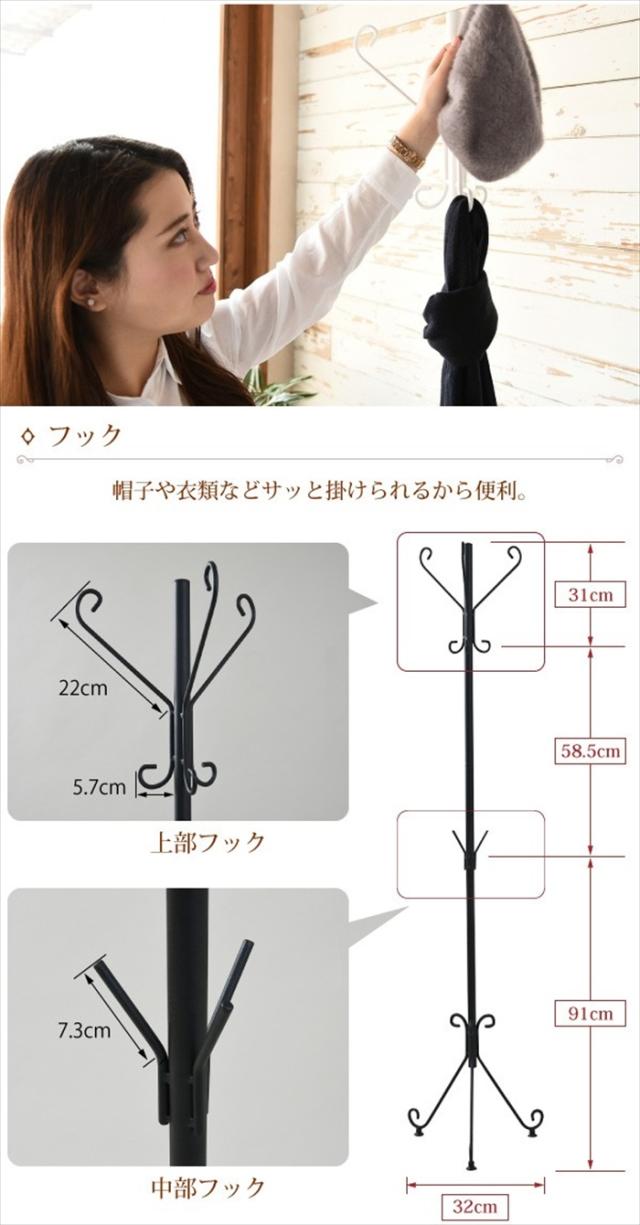 3段階の高さでそれぞれ3か所、帽子やマフラー、ストールなどを掛けられます。